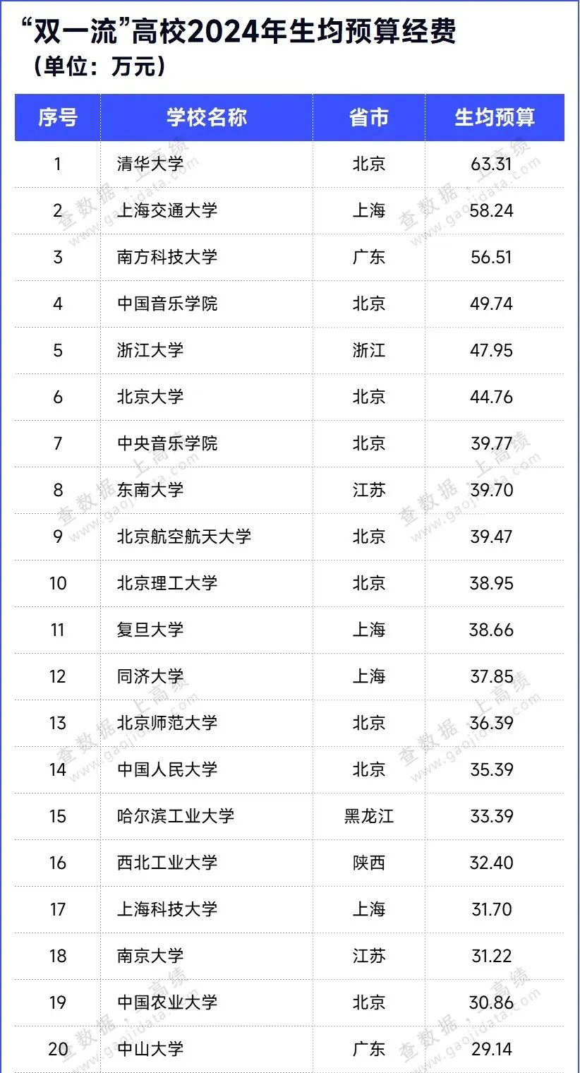 根据高绩数据,2024年高校生均经费排行榜中,南方科技大学排名第三,仅次于清华大学和上海交通大学,同属中科系的上海科技大学也位列第17,压过南京大学、中山大学等一众老牌985一头。