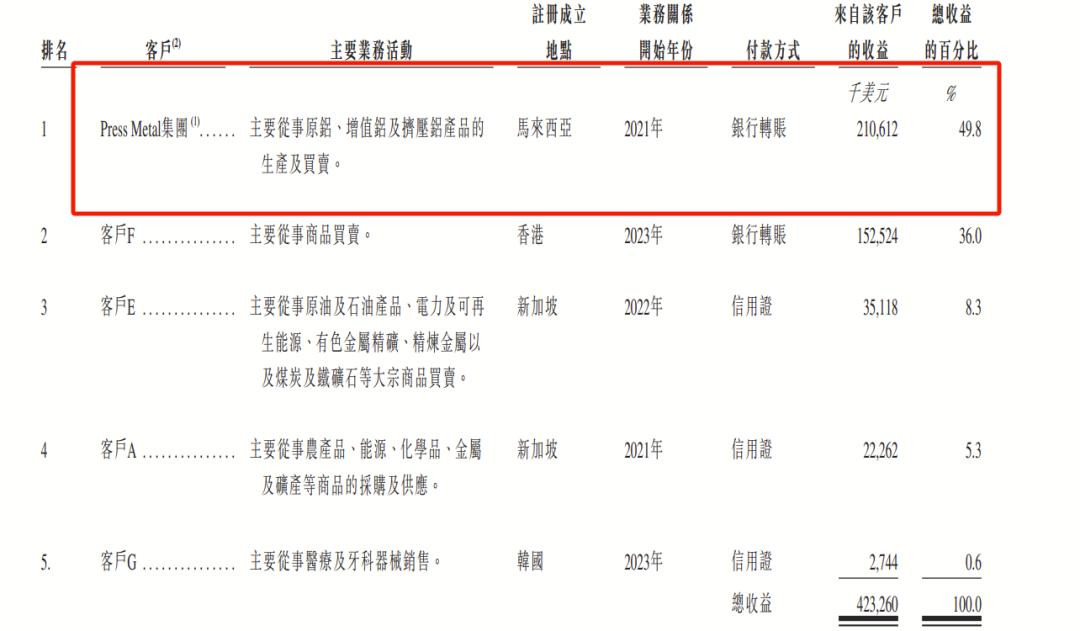 除此之外,南山铝业国际还面临着对大客户的依赖风险。《招股书》显示,2021年至2023年及2024年上半年,公司前五大客户献了100%的收入。特别是马来西亚铝业巨头Press Metal,不仅是南山铝业国际最大的客户,还是公司第二大股东,持股25.59%。