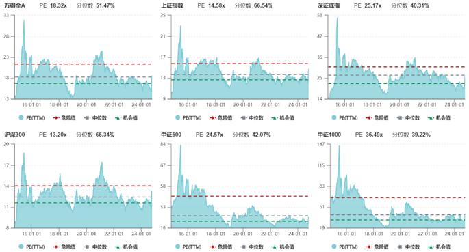 分指数来看,市盈率绝对数方面,大盘股>中盘股>小盘股的特点依然存在,但由于今年市场对金融、公共事业等高股息资产的追捧,使得大盘股指数的估值分位数明显高于中小盘股,如沪深300近十年估值分位为66%,而中证500、中证1000的估值分位数则分别为42%、39%。