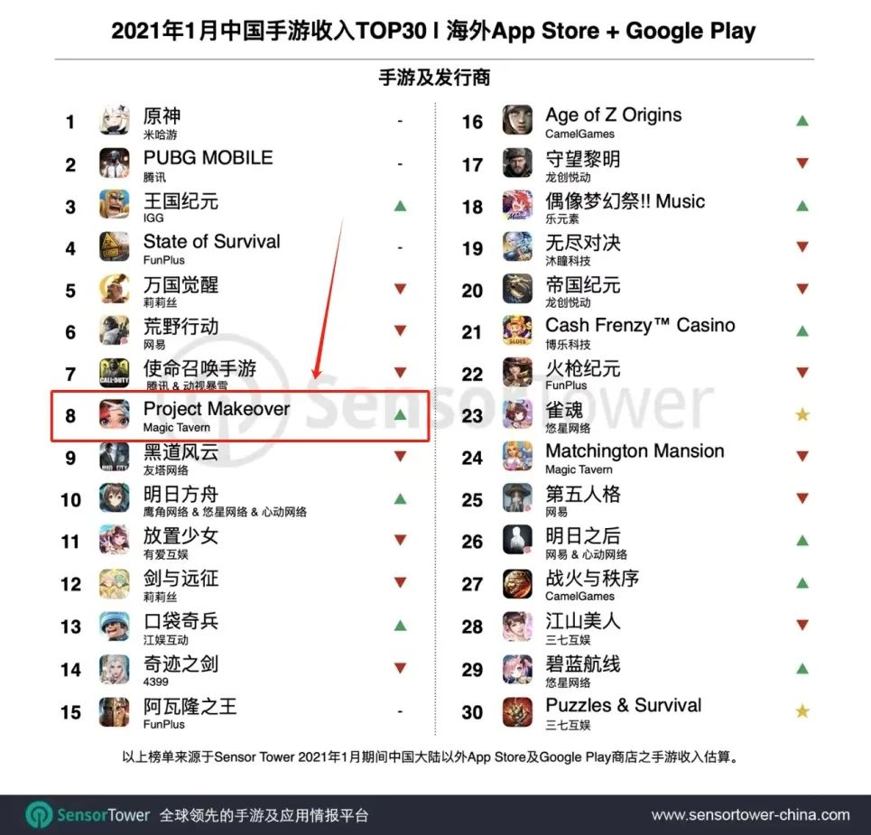 「Project Makeover」是「Gossip Harbor」之前最后一款进入出海手游畅销榜 Top 8 的大休闲产品,在 2021 年 1 月达成 | 数据来源:Sensor Tower