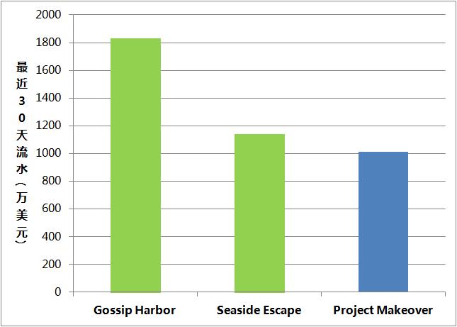 两款产品在今年都保持了相当稳定的增长势头,且都已经超过「Project Makeover」,成为目前出海大休闲产品月流水 Top 2。目前「Gossip Harbor」最近 30 天流水分别为 1832 万美元,「Seaside Escape」为 1138 万美元,均高于「Project Makeover」的 1014 万美元。