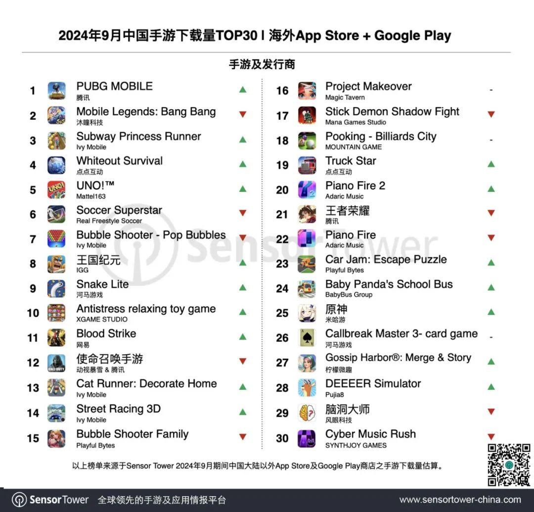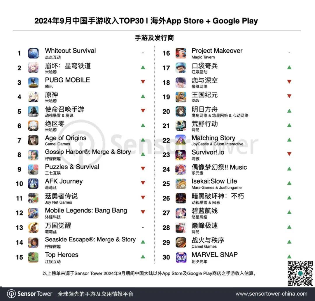 今日(10月14日),Sensor Tower发布了2024年9月中国手游产品在海外App Store和Google Play的收入排行Top30(本报告仅统计应⽤商店IAP预估值,不包括⼴告变现收⼊和中国地区第三方安卓渠道收入)。