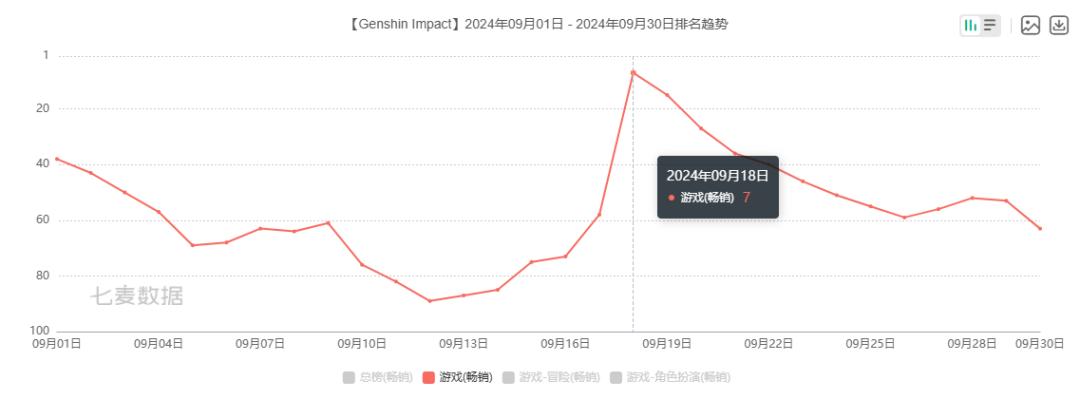 首先来聊聊老产品《原神》。9月17日,《原神》开启限定五星角色“基尼奇”和“雷电将军”祈愿活动,该游戏日流水随即快速上涨,并于翌日跃进美区iOS游戏畅销榜TOP7。