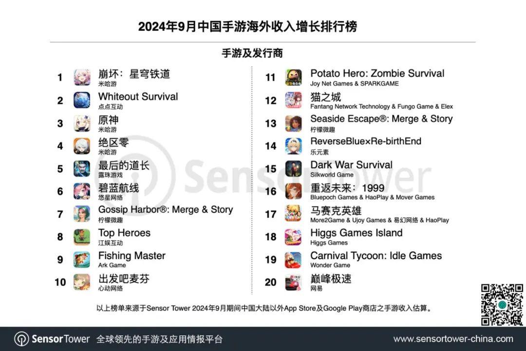 此外,Sensor Tower还公布了9月中国手游海外收入增长榜和下载榜。