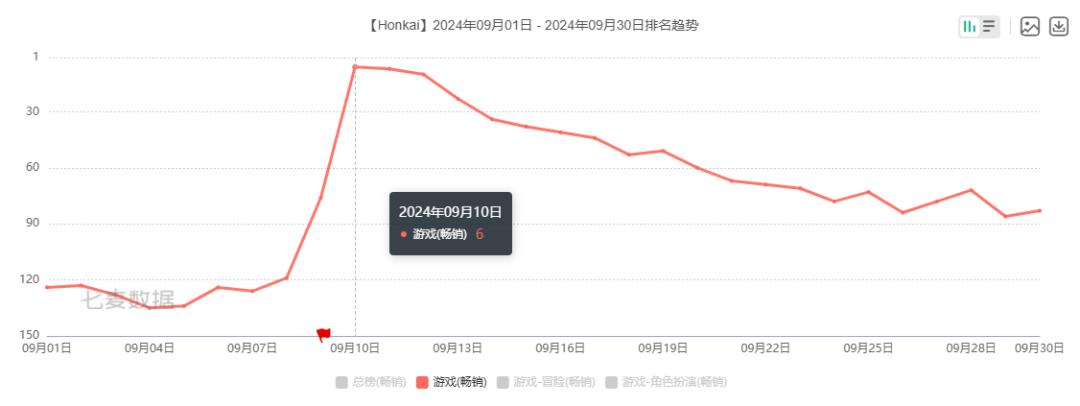 据ST统计,《崩铁》9月海外收入环比激增68%,斩获本期出海手游收入增长榜冠军,排名跃升6位至收入榜第2名。