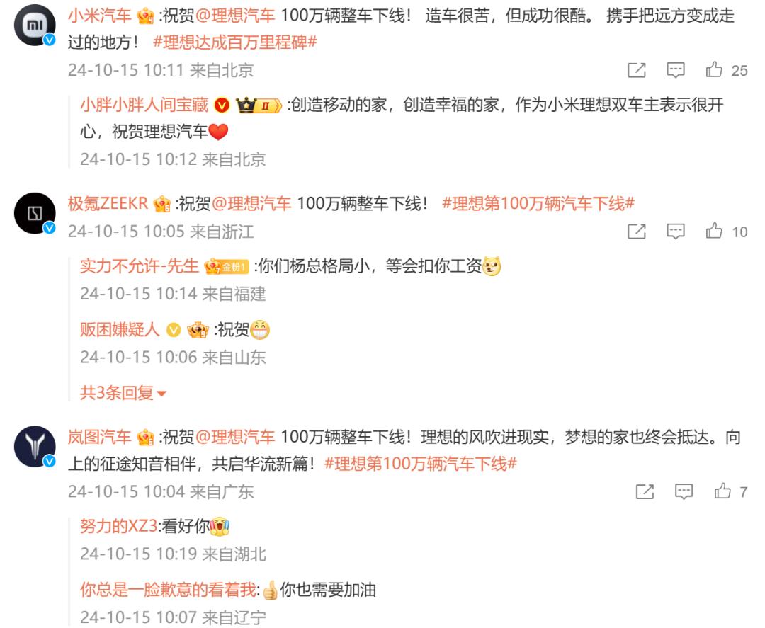 也就在理想发微博官宣达成百万之际,小米汽车、极氪汽车、岚图汽车也率先向理想发去贺电,恭喜其达成100万整车下线。