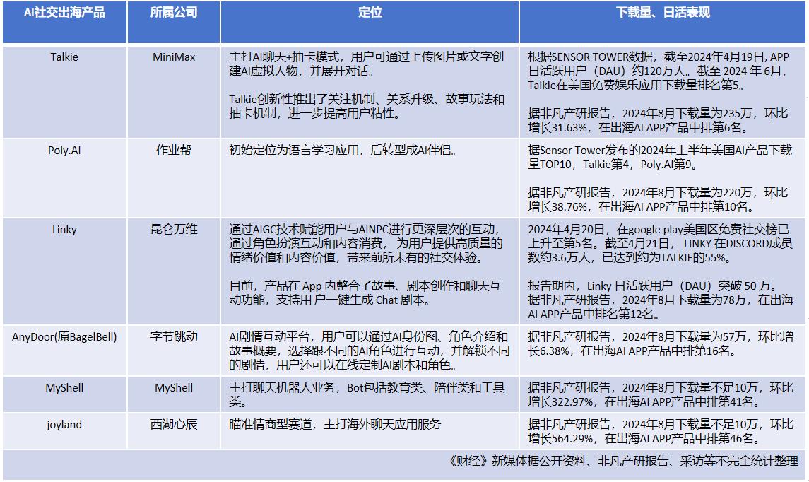 《财经》新媒体注意到,国内AI社交新秀也不甘落后。非凡产研统计的2024年8月中国出海AI应用产品榜单中,Talkie、Poly.AI、Linky、AnyDoor等多款AI陪伴社交产品挤进下载量前20名。