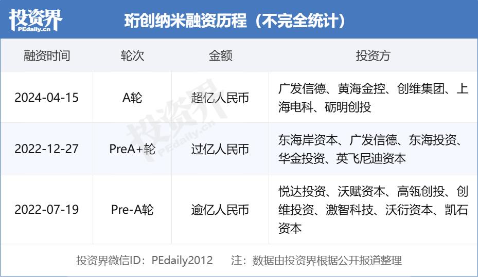 我们先看一起融资事件:今年4月,专业从事新能源电池核心材料企业珩创纳米完成A轮超亿元融资,由广发信德领投,黄海金控、创维投资、电科基金、正景资本跟投。