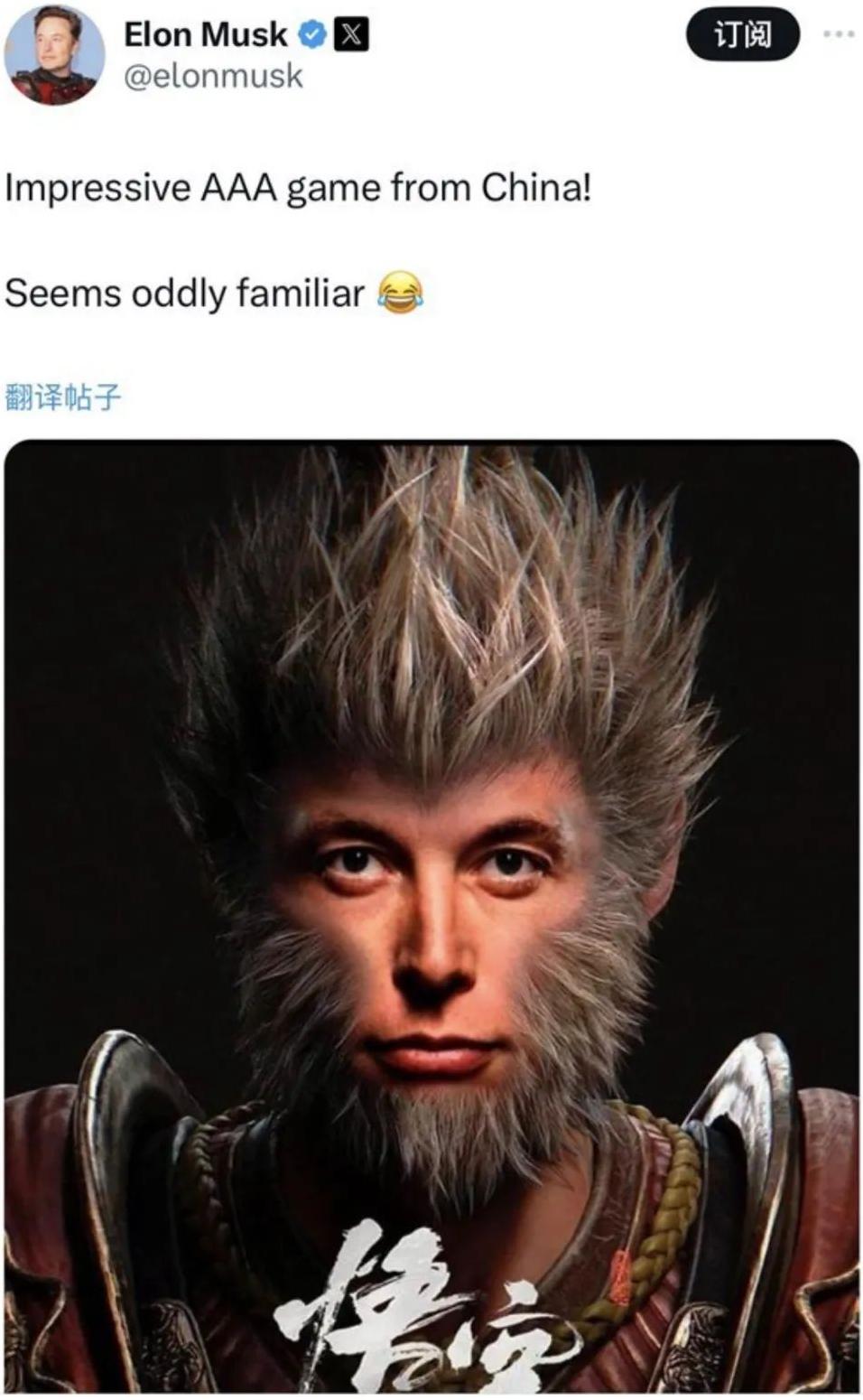 在海外游戏市场,《黑神话·悟空》不仅吸引了众多海外游戏玩家下载,赢得了很多海外游戏大V的鼎力推荐。美国企业家马斯克也在玩《黑神话·悟空》,还在社交网络分享了一张AI生成的游戏海报图,将游戏主角“天命人”的脸换成了自己。