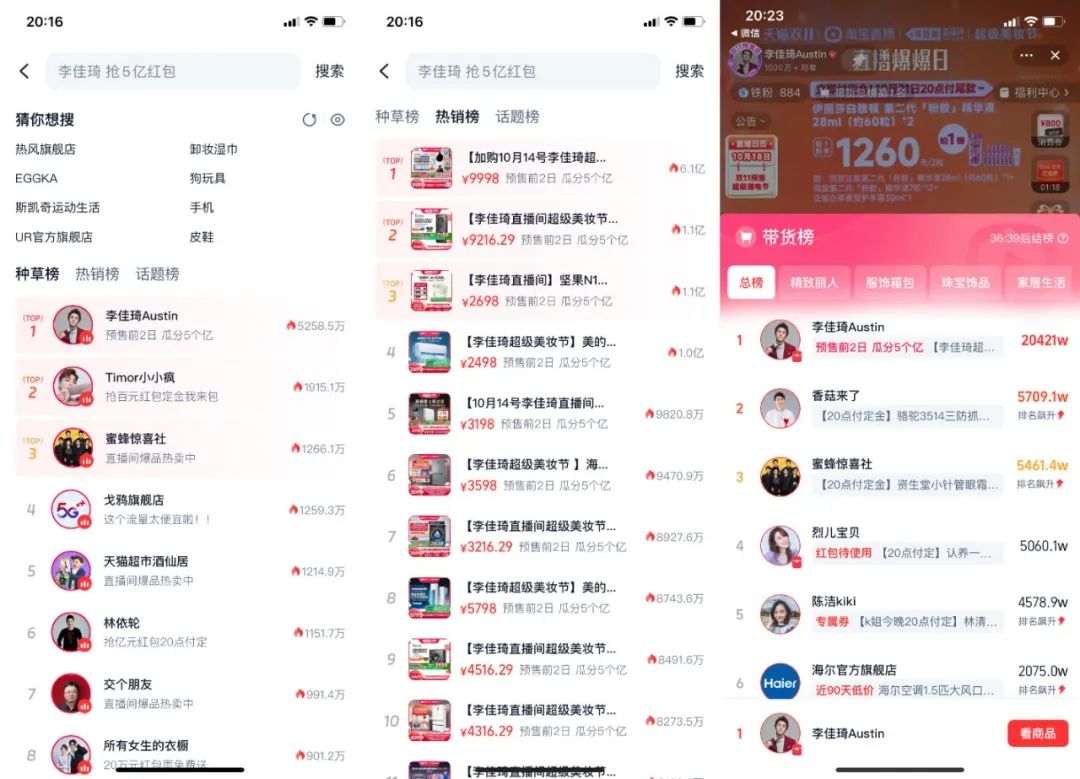 事实上,自14日上午7点半开始,李佳琦直播间在淘宝直播“种草榜”和“带货榜”就一直稳居断层第一。预售开始15分钟,李佳琦直播间种草热度达5000+,第二位的直播间仅1000+;热销榜TOP10产品链接,也全部来自于李佳琦直播间。预售开始约20分钟,李佳琦带货榜热度值突破2万,比榜单第二高出1.5万。