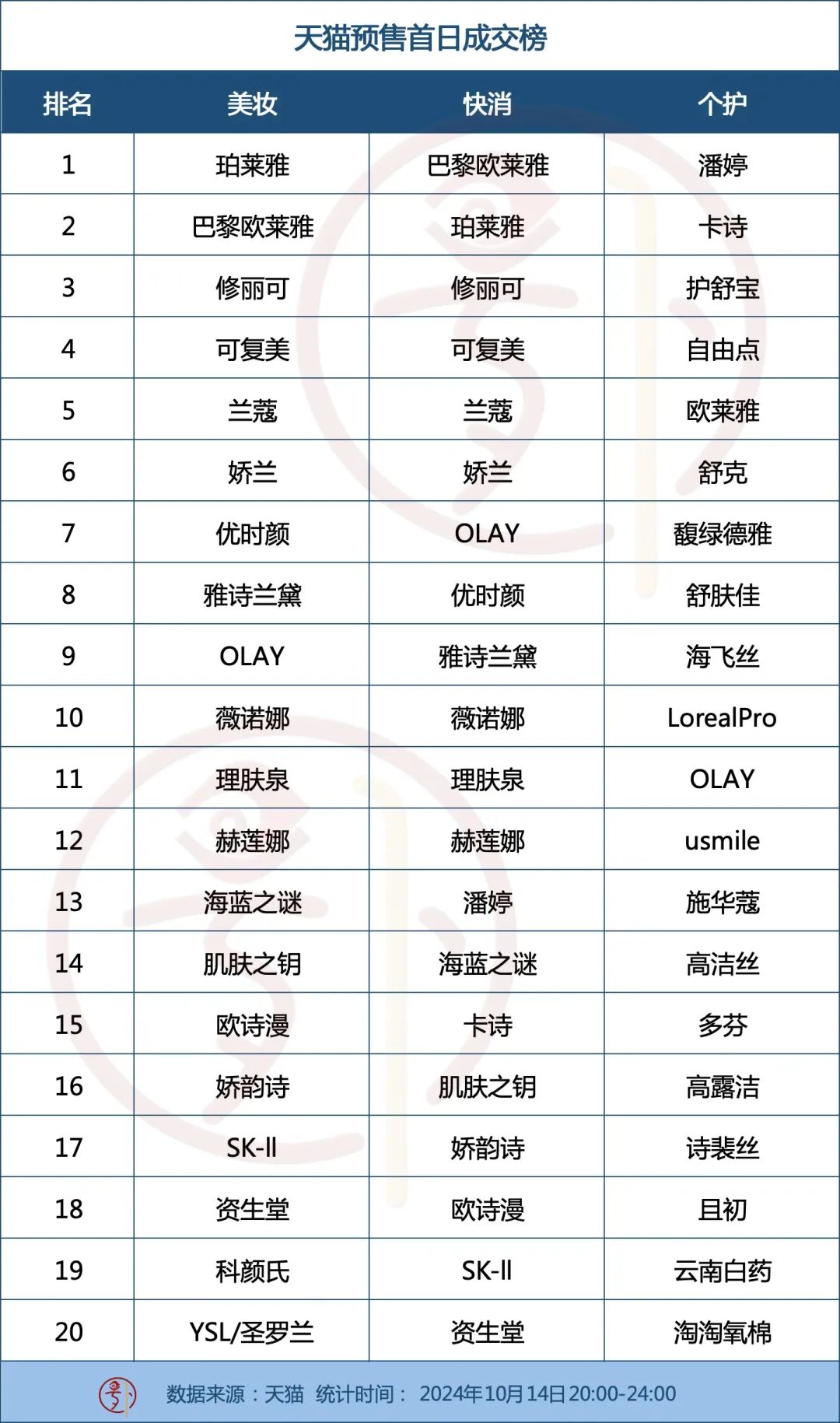 珀莱雅第一,巴黎欧莱雅第二。从天猫双11预售首日成绩单来看,珀莱雅继续蝉联第一,巴黎欧莱雅则位居第二,第三则被修丽可占据,去年位列榜单第三的兰蔻此次则下滑至第五名。