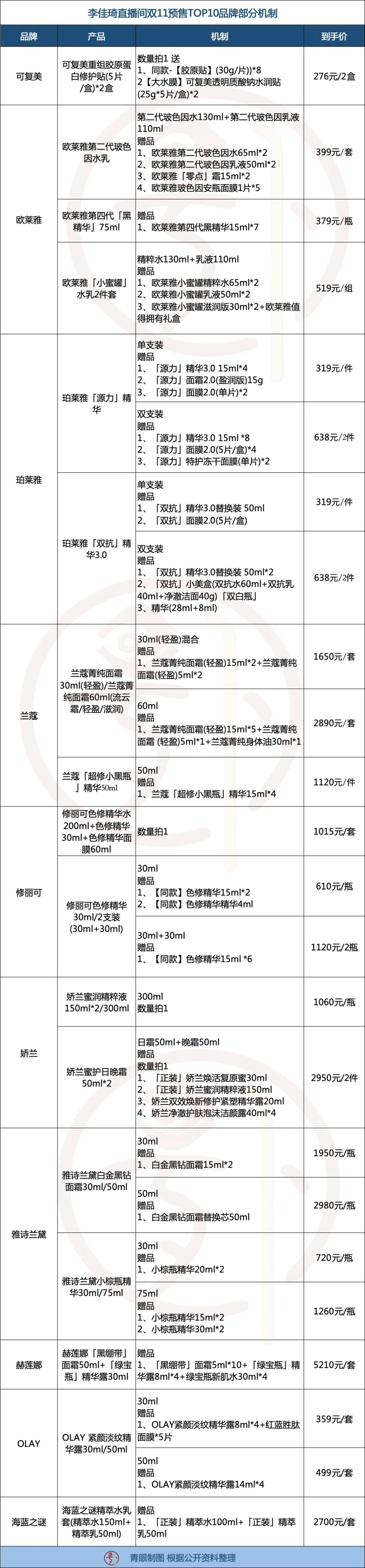 低价仍是主旋律,“买正送正”已经成常态。青眼号外注意到,为迎合大促需求,在李佳琦直播间包括海蓝之谜、科颜氏、娇兰、WHOO、SK-II、雅诗兰黛、倩碧、朵梵等国际大牌,以及自然堂、瑷科缦等国货品牌,均推出了“买正送正”的机制。青眼号外也统计了李佳琦直播间TOP10品牌的部分机制,发现品牌们均拿出了较高力度的折扣。