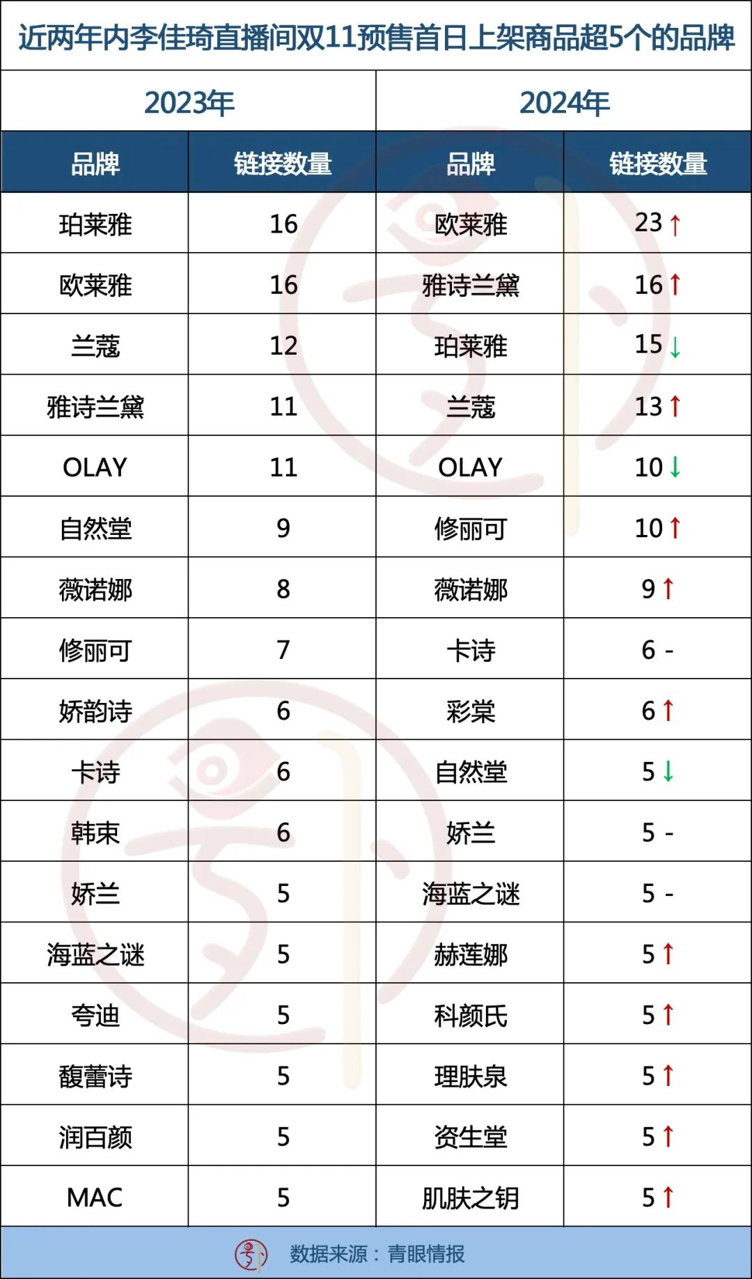 不过,珀莱雅、OLAY、自然堂链接数量均有小幅度减少,此前入榜的娇韵诗、馥蕾诗、MAC、韩束、夸迪、润百颜的产品链接均不及5个。