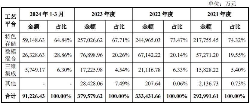 报告期内,特色存储领域实现的收入占主营业务的比重有所下降,但仍在60%以上。相对应的,数模混合工艺平台实现的收入占比从2021年的19.55%提升至2024年1-3月的28.86%,占比逐步提升。
