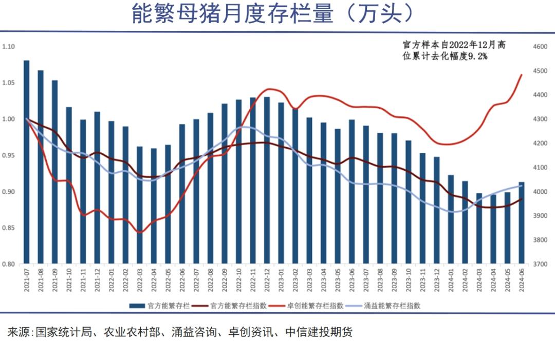 本轮能繁母猪去化周期,从2022年12月的顶点一直持续到2024年4月,累计下降9.2%。复盘历史,每轮能繁去化幅度均在8%以上,而8%~10%的去化足以酝酿出新一轮行情。