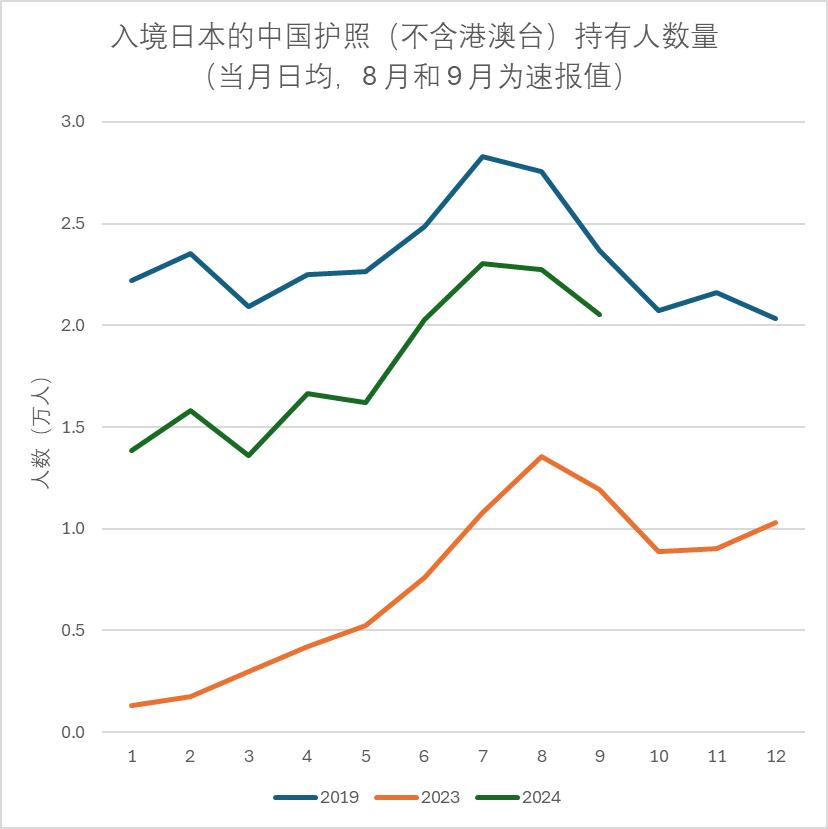 趁着暑运的“西风”,赴日的中国护照(不含港澳台,下同)护照持有人,在2024年6月突破了每日平均2万人的水平,并连续保持了四个月的规模。更进一步来看,2024年9月和2019年同期相比,已经恢复到了87%。