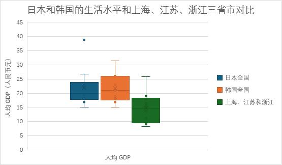 按如今的汇率计算可以看到,江浙沪有一半的人的生活水平(按人均GDP计算)已经达到了日本、韩国的最低生活水平,有25%的人的生活水平已经和除了首都东京以外的日本不分伯仲(其中,上海、江苏有50%左右的人口,浙江也有三分之一)。