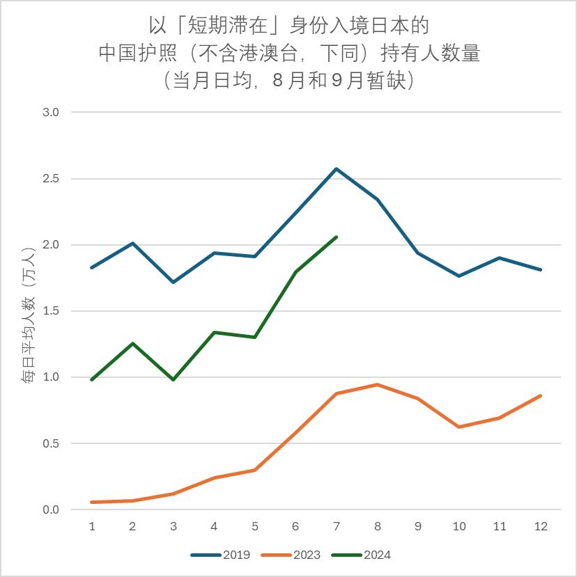 其中,剔除掉等在日华侨、留学生等的“单纯访客”(以「短期滞在」身份访问日本),在2024年7月达到了2.1万人,占总体2.3万人的90%以上。