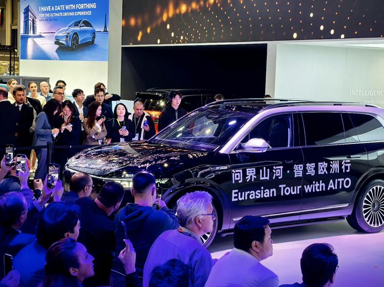 问界展台上,一辆问界M9从重庆行驶到巴黎,历时38天,问界M9的海外版命名为AITO 9,此次也在巴黎车展上正式发布,“hello paris”的灯语,硬核的智驾,直指欧洲豪华车市场。