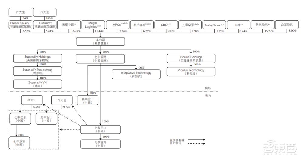 截至招股书签署日,七牛智能拥有7家中国子公司,即七牛信息、七牛香港、七牛深圳、北京空山、上海空山、嘉兴空山、北京空雨,以及6家国外全资子公司。阿里巴巴通过淘宝中国持股16.27%,云峰基金通过盈动物流(Magic Logistics)持股11.44%,而淘宝中国也是七牛智能最大的外部股东。