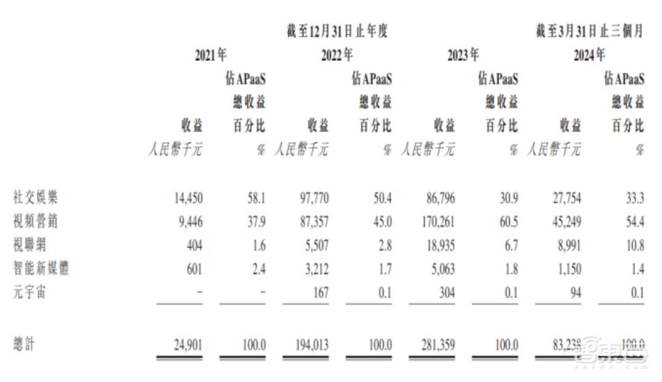 APaaS业务的创收主要来源于社交娱乐和视频营销这两大项目,今年一季度,二者的合计营收占业务总营收的比例为87.7%。从2021年至2023年,视频营销和视聊网项目在总营收中的占比不断大幅提升,但社交娱乐项目的占比则逐年下降,特别是去年曾同比缩减了近2/5。