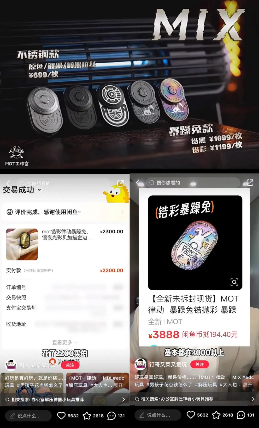 以EDC玩具为例,今年年初,MOT工作室推出一款暴躁兔版皓彩推牌,售价1199元/枚,据博主“钉哥又菜又爱玩”公开视频透露,因没有抢到官方发售款,他以2200元的价格才在二手市场买到同款,今年5月,该款推牌的价格在二手市场一度升到3000元以上的价位。