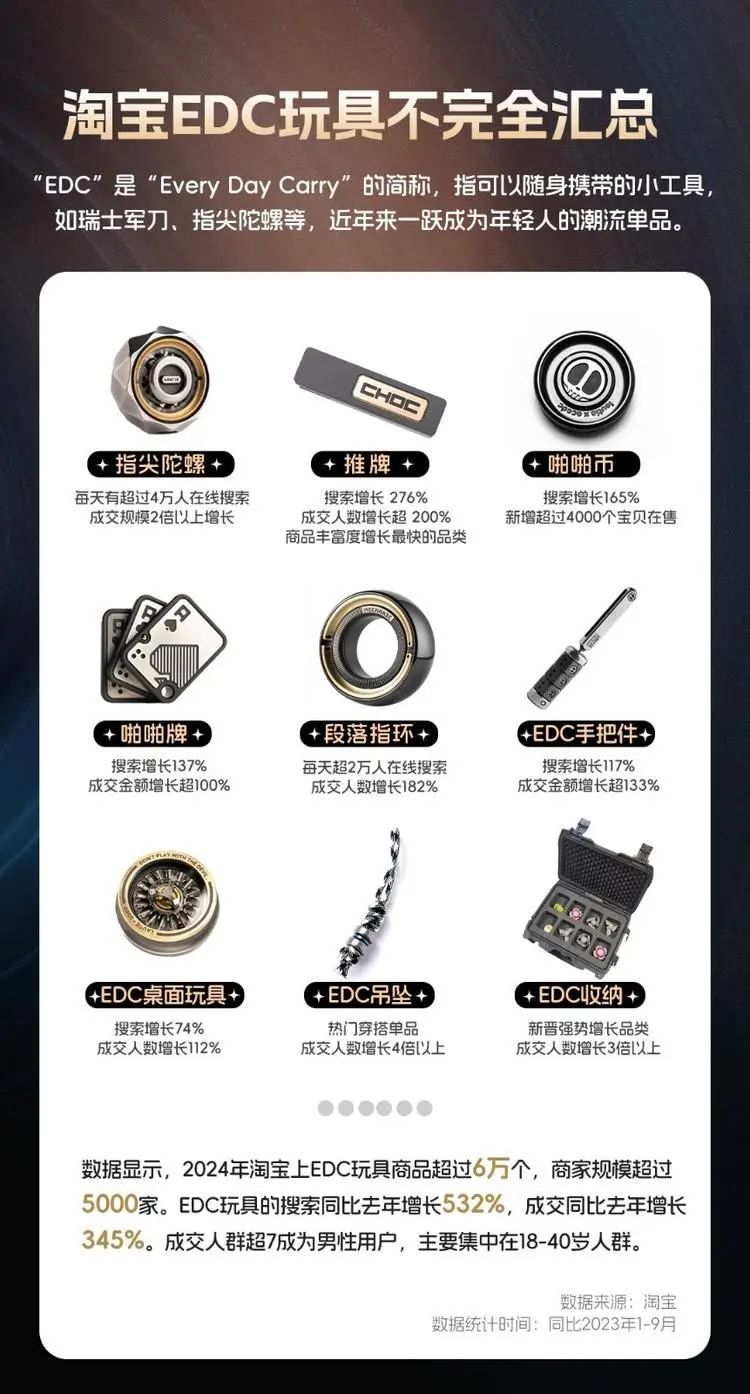 随着圈子内发烧友对于这些工具颜值与可玩性需求的不断扩大,EDC逐渐衍生成EDC玩具的概念,去年火爆全网的指尖陀螺,让EDC玩具在更多男性消费者中开始流行起来,还被选为淘宝年度玩具大赏2023年度爽翻天奖。