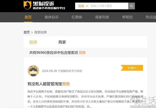 此前在今年618期间,淘宝天猫、京东等头部电商平台纷纷取消了沿用10余年的预售机制、直接现货开售,无疑成为了一大亮点。一众电商平台的此举,也被外界视为旨在提升消费体验,围绕“用户至上”下功夫,毕竟大家可谓是“苦预售久矣”。如今以“预售”为关键词在“黑猫投诉”平台搜索可以看到,相关投诉多达数万条,且其中大部分都与预售虚假宣传、延迟发货有关。此前中消协发布的2023全国消协组织受理投诉情况分析也表明,“十大消费投诉热点”的第一条就是“电商平台预售模式亟待规范”。