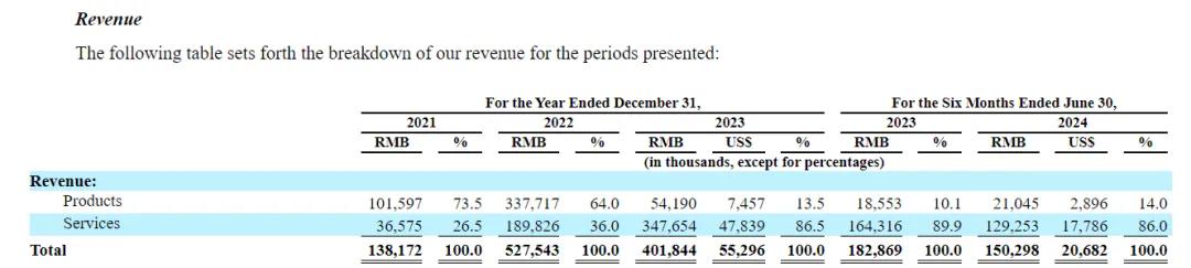 两大营收板块在2023年之前,产品收入占据主要部分,营收占比都在6成以上。招股书显示,自2021年开始,产品和服务的收入在三年间分别为1.02亿元、3.38亿元、0.54亿元和0.37亿元、1.90亿元、3.48亿元。