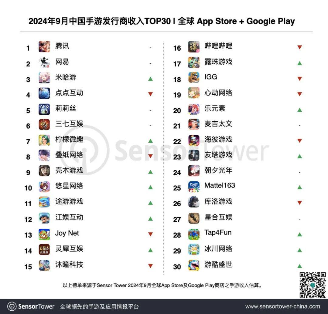 10月16日,Sensor Tower发布了2024年9月中国手游发行商全球收入排行榜TOP30。
