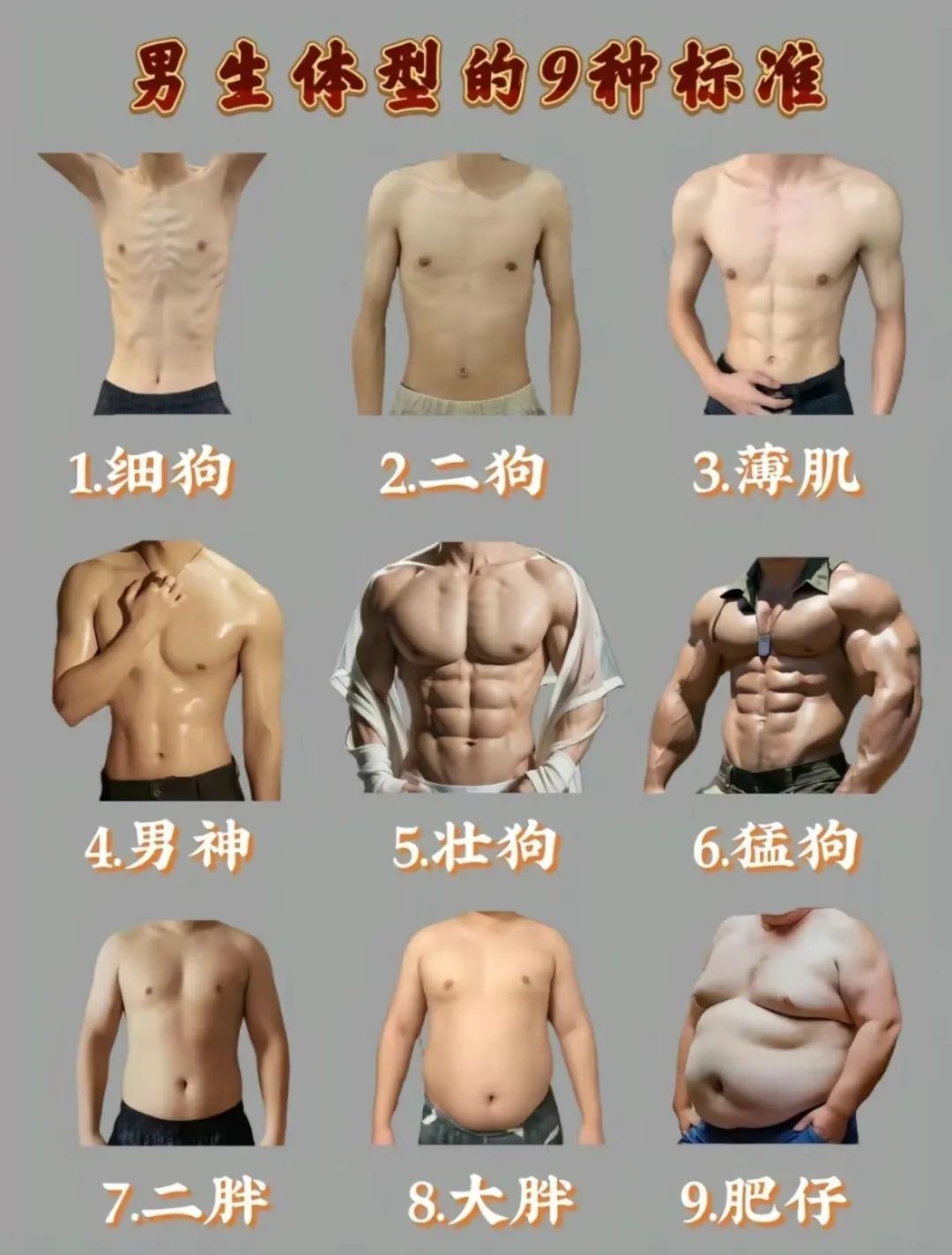 男性的身材焦虑隐藏于更深层次的忧虑下,刻板印象背后的身材选择并不多:细胳膊晃荡在宽大的袖口里免不了被叫一声「细狗」;大块肌肉往往劝退异性;脂包肌更是直接被定义为胖子。