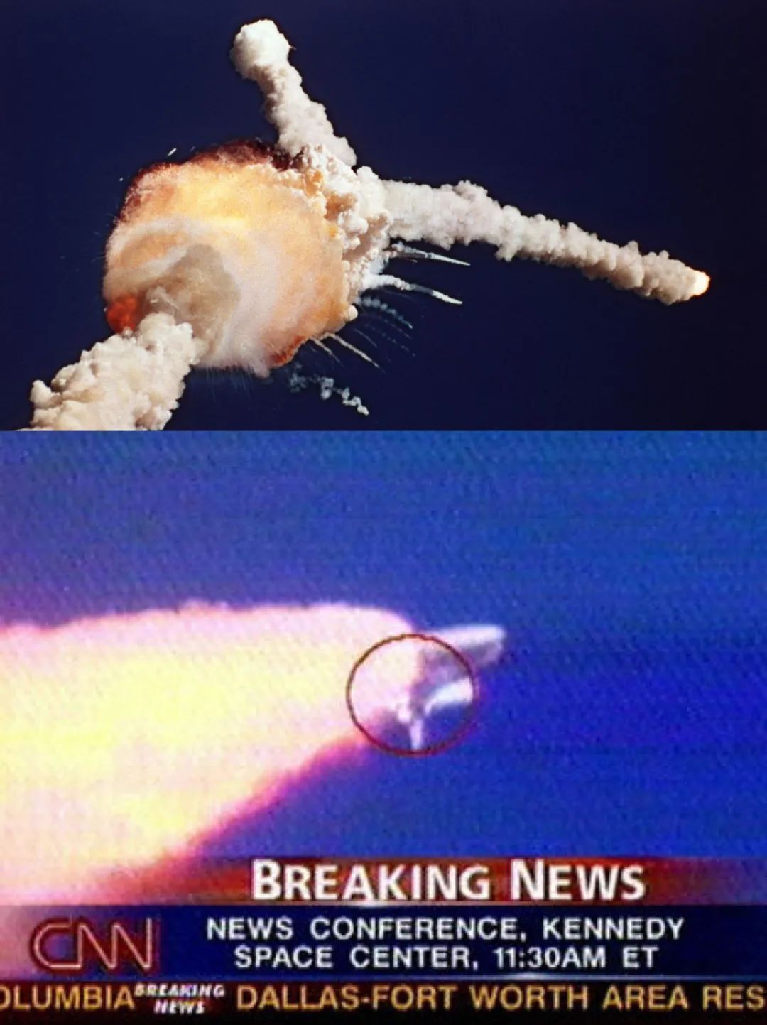 上图:挑战者号起飞73秒后在空中爆炸,下图:哥伦比亚号返回大气层时解体。两次事故造成14名机组人员全部遇难