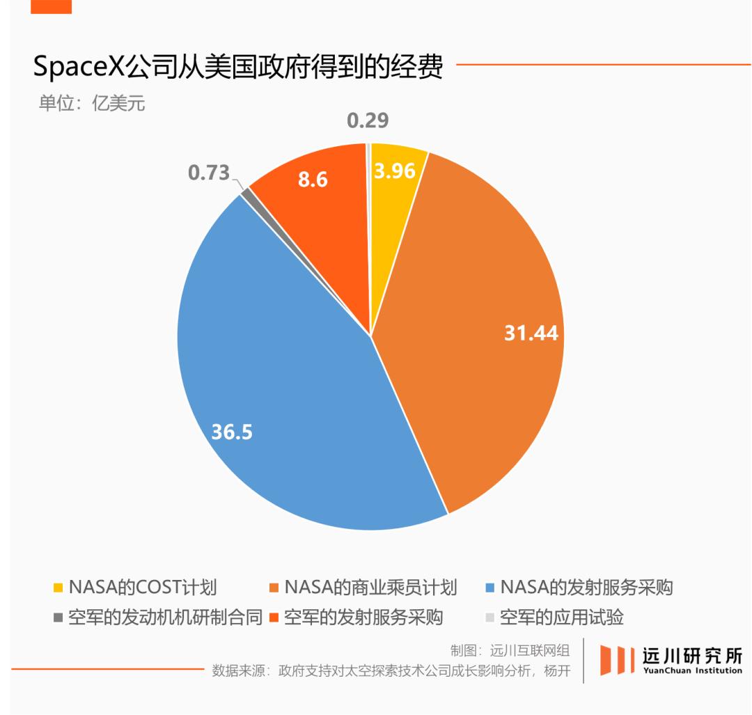 相比商业公司订单和有限的个人投资,政府订单才是SpaceX运营的支柱。SpaceX从美国政府得到的各类项目经费高达80多亿美元,其中NASA提供了约72亿美元,空军提供约9.6亿美元。