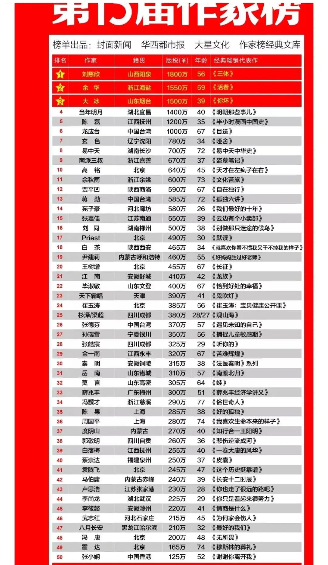 在大冰的书最火的时候,作家榜排名第三,版税高达1500万,拳打莫言、冯骥才,脚踢冯唐、张小娴。