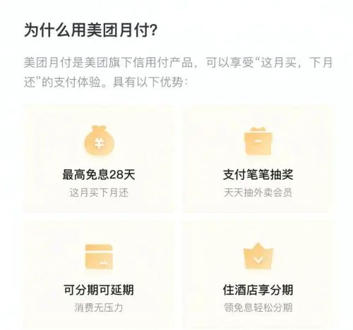 值得一提的是,今年年初,美团上线了“月付功能”,利息期限为38天,按时还款平台不收取任何费用。