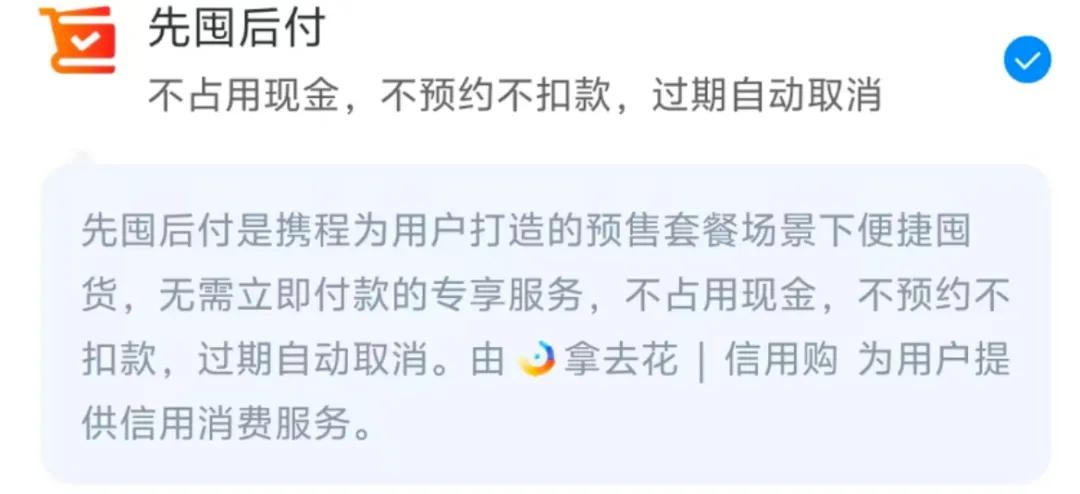 国庆前,先是携程定向邀请部分用户内测了一项新功能:让消费者可以在授信额度内先“囤”酒店预售套餐,预约酒店核销后的还款日(约一个月后)再还款即可。