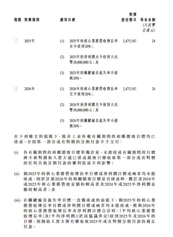 具体来看,公告中列举出了许多绩效目标,包括“2024年的核心业务营收增长率至少到20%,2024年第四季度的净利润至少达到人民币600万元,或2027年第一季度的净利润与2026年第一季度相比增加不少于20%,及2024年的关键雇员流失率不超过20%……”