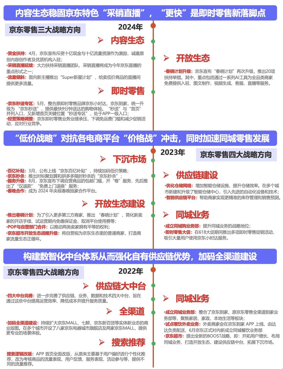 其实随着电商行业的竞争日益激烈,京东零售业务在过去几年里也在不断调整其战略以适应市场的变化。2019年春节,刘强东发出了一封题为《坚持价值创造,迎接春天的到来》新春贺信,宣布京东商城正式升级为零售子集团,随后徐雷继续负责担任京东零售CEO,同时提出了京东零售必赢之战1.0版本:全渠道、下沉市场和平台生态。意味着京东零售将更加聚焦于线上线下融合的全渠道零售模式,通过整合线上电商平台和线下实体店,实现商品、服务和用户体验的无缝对接。以及通过下沉市场拓展更广阔的消费人群和市场潜力,寻求新增长点。