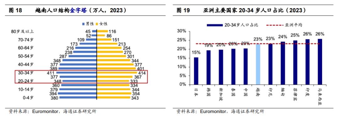 据Euromonitor数据和海通证券分析,越南的人口结构呈现金字塔型,中位数年龄34岁,2023年越南20-34岁人口占比为23%,整体较为年轻化,结构优,处人口红利期。