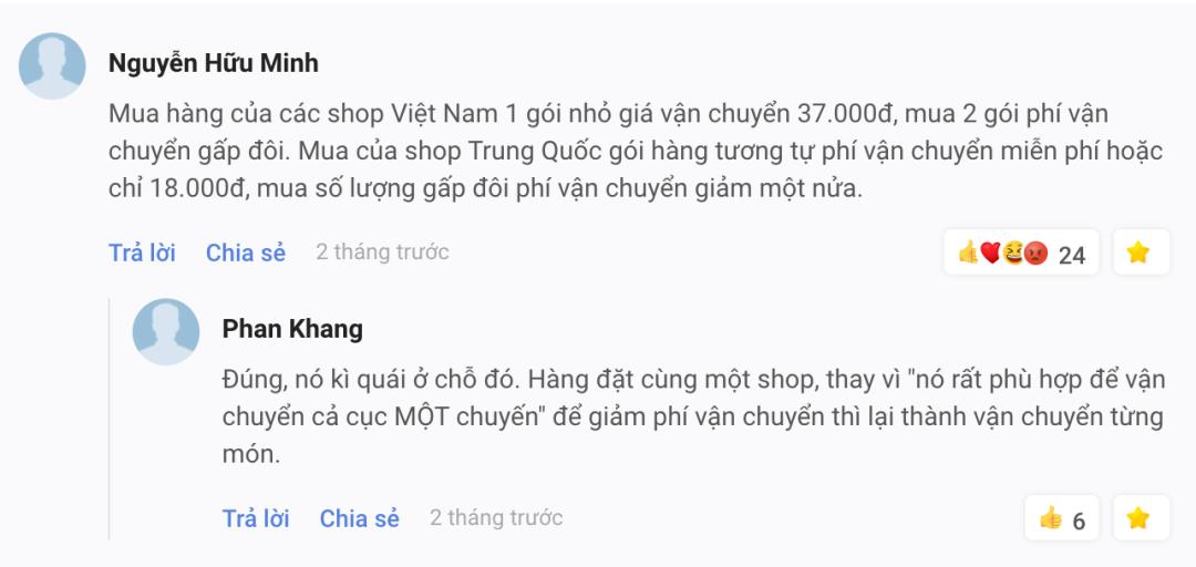 一位越南用户说:在越南商店购买一小包商品,运费为37,000越南盾,买两包运费则翻倍。而在中国商店购买同样的商品,运费要么免费,要么仅需18,000越南盾,购买双倍数量时运费减半。