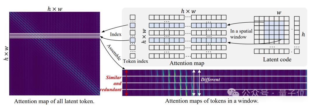 然后将位于同一个空间窗口token的注意力图组合到一起,如图右侧所示,其中垂直轴表示窗口中的不同token,水平轴表示窗口内token与所有token的关联程度。