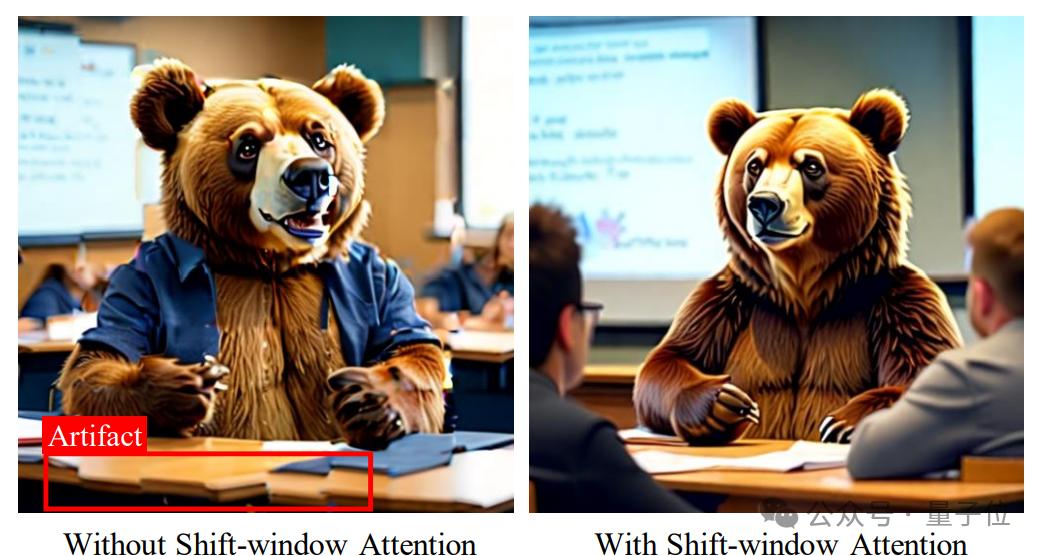不过仅有window attention会导致窗口间token缺乏联系,导致生成图像格子现象明显。