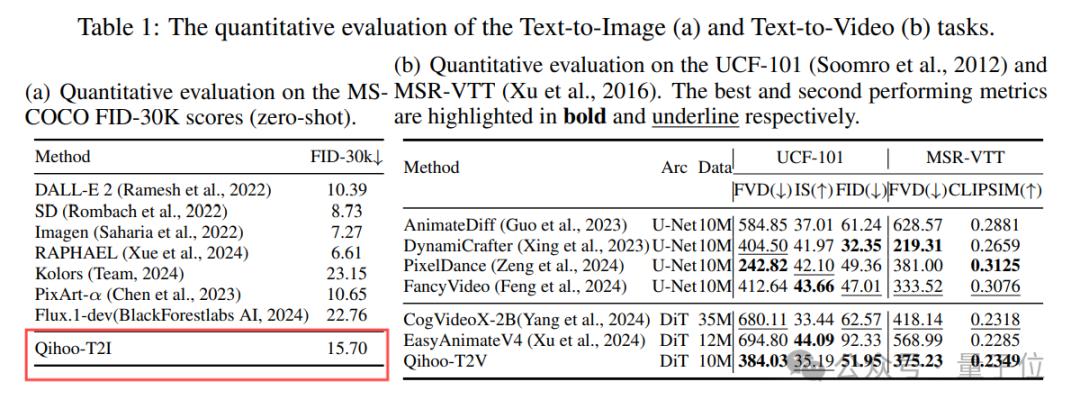 研究团队在MS-COCO FID-30K, UCF-101和MSR-VTT等benchmark上定量评估Qihoo-T2I和Qihoo-T2V。