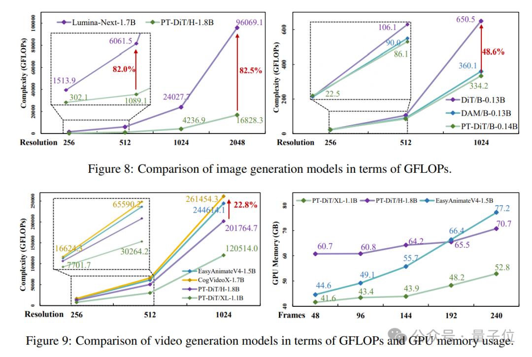 如图所示,无论是图像或视频生成任务,在相同参数规模下,PT-DiT相比现有Diffusion Transformer方法,均有大幅度的计算复杂度优势。