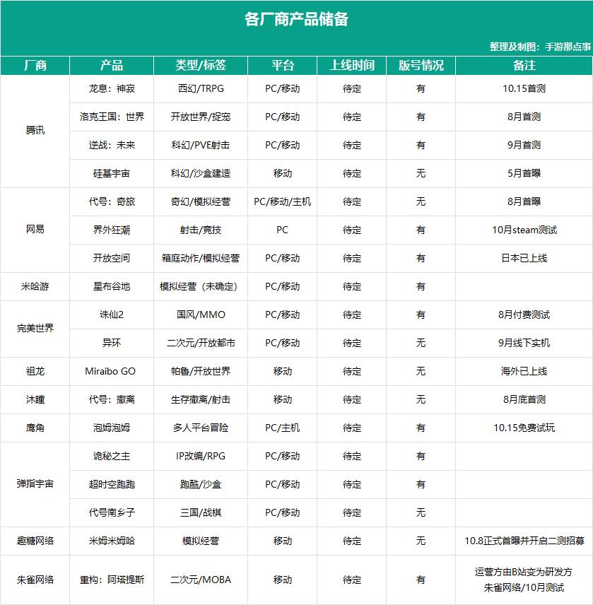 当然,除了这些大概率或是明确定档Q4、上线在即的新品,不少厂商手里还捏着许多已经拿到版号,距离上线并不遥远的潜力股。在此之外,也有尚无版号,但热度不低的新产品同样值得关注。