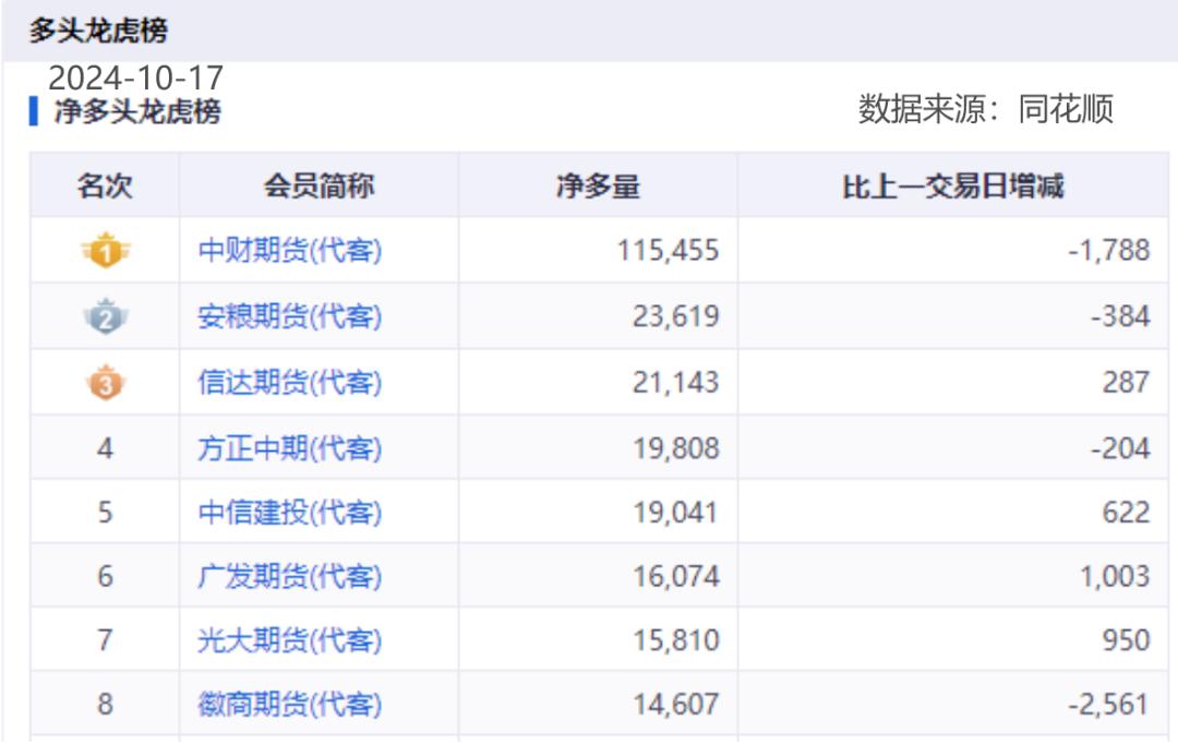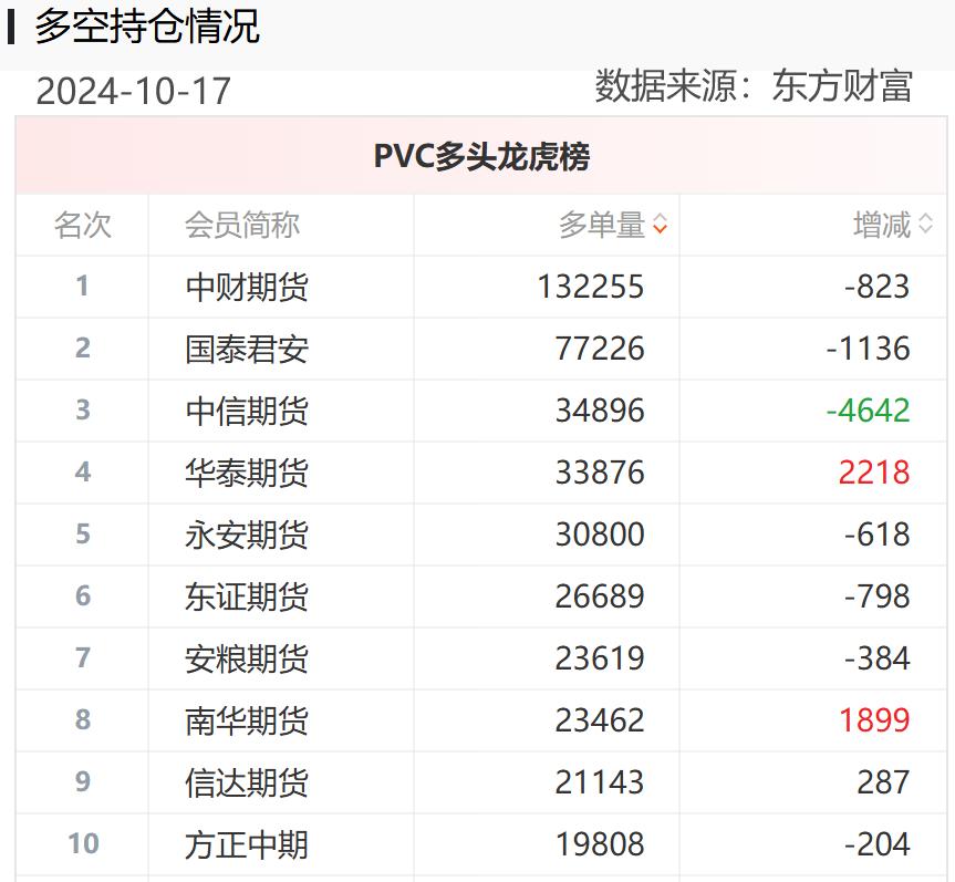 从10月17日的PVC期货持仓数据可以看出,在净多头榜上,榜一的中财期货席位PVC净多头持仓量为11.55万手,明显要多于其他期货公司席位的净多头量,比净多头龙虎榜第2~6名的净多头持仓量之和还多。