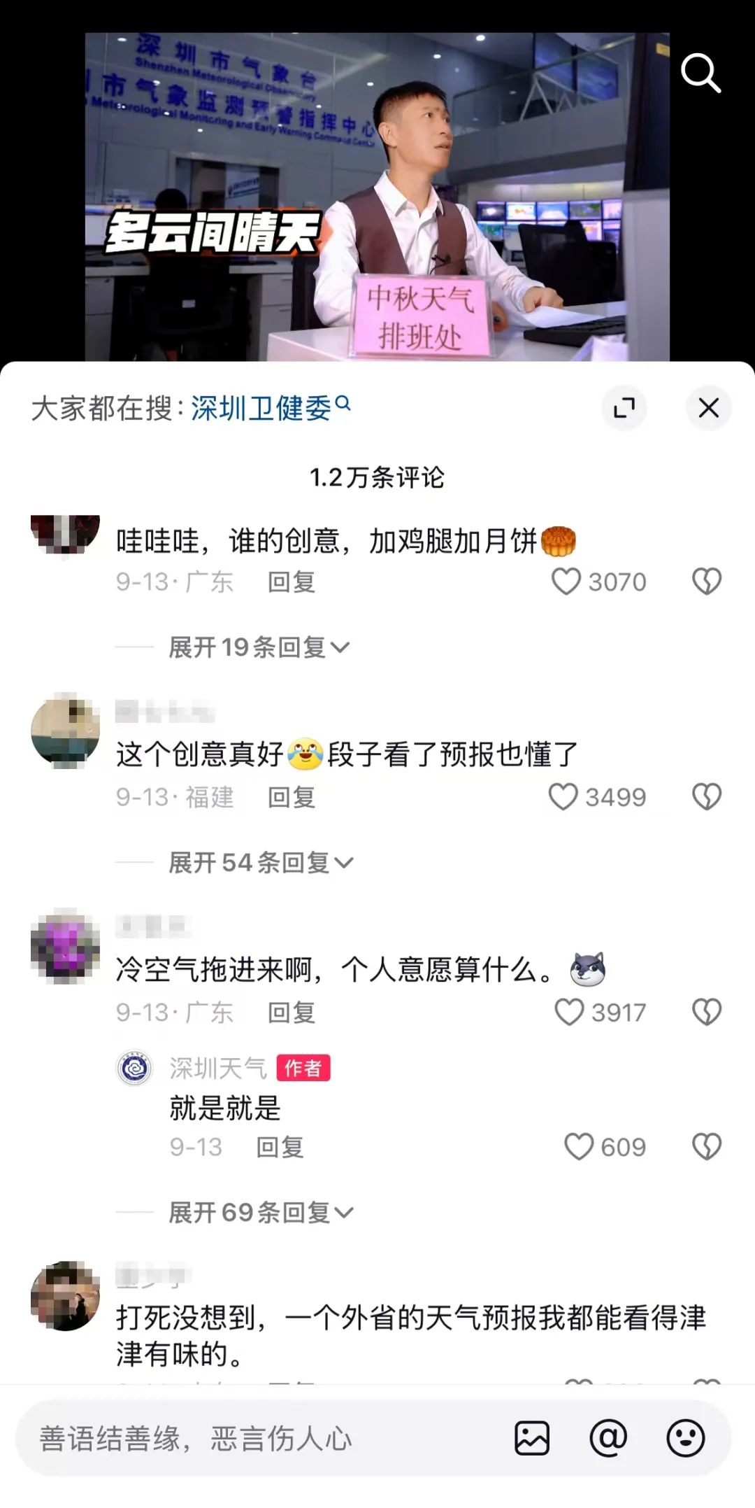 翻阅深圳天气的账号后发现,@深圳天气 此前就开始在视频的内容和形式上进行创新,例如今年中秋之际@深圳天气 将深圳中秋三天的天气以排班的形式呈现,在贴近生活的场景和趣味的段子中,将中秋三天的天气悄然形象地传达给大家,该视频至今已获得9万的点赞量,网友也对此类创意表示肯定:“建议全国普及@深圳天气 的脑洞,看谁还不爱看天气预报?”