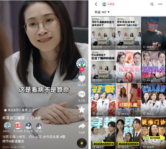 值得注意的是,克劳锐翻阅众多官方蓝V账号视频发现,跨界合作似乎也是目前官方蓝V探索的新方向之一。罗平交警不仅常与其他官方蓝V共创视频,还邀请其他创作者达人出镜故事向的宣传视频;深圳卫健委也邀请到@今日头条 参与负责策划、导演、编剧等内容,@口口医生 等创作者出镜演绎,发布《当医生内心过于诚实》《过期儿童疑难门诊》《穿越到霸总剧里当冤种护士》等视频。这一方式既保证了视频内容的质量,也成了官方号拓展影响力的渠道之一。