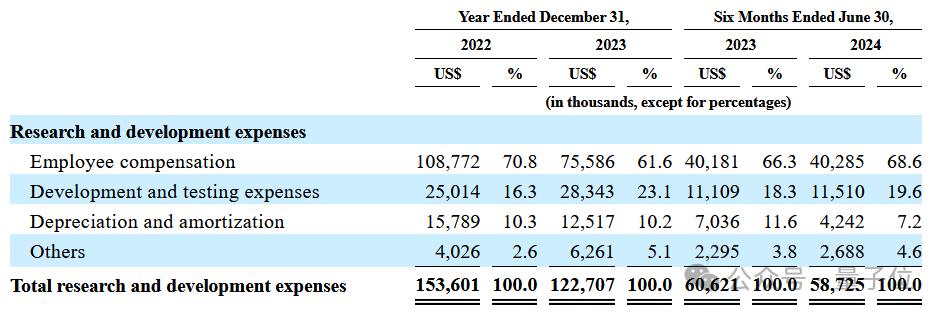招股书中详细列出了研发费用的明细,主要包含员工薪酬福利、开发和测试费用,与研发相关的折旧和摊销等等。