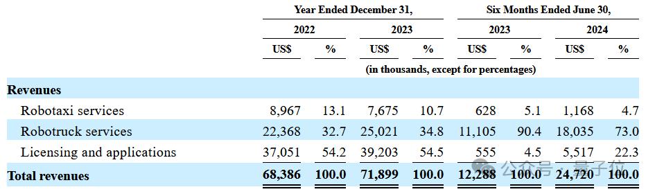 今年上半年,自动驾驶出行和货运服务共计营收1920.3万美元(约1.37亿元),占据总收入的77.7%。